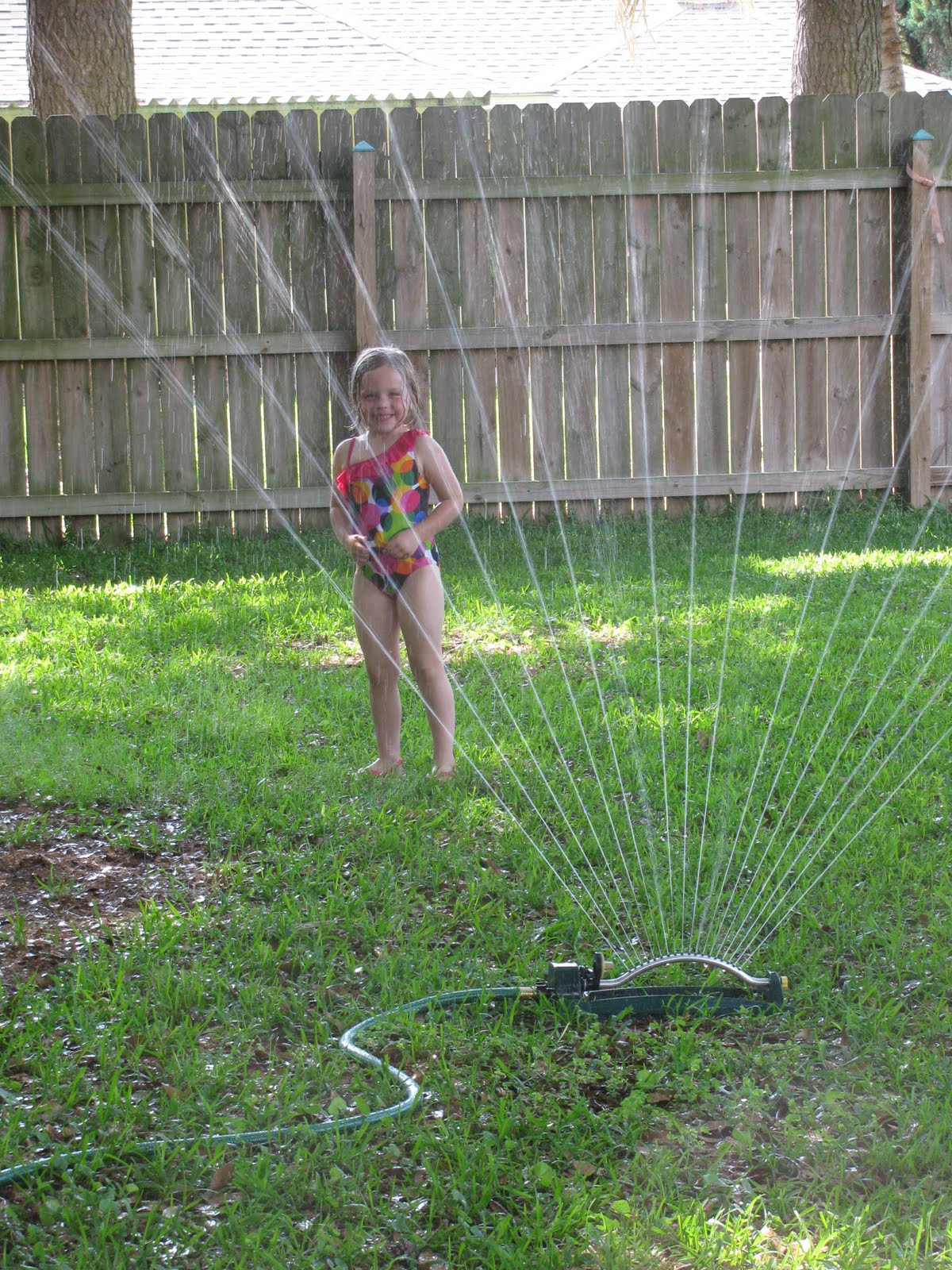 AC has been asking to play in the sprinklers in the back yard. Simple enough. So after school yesterday, we set up the sprinkler and she thought she had hit the jackpot! At one point, she decided just the hose would be fun, so we took off the sprinkler and the fun continued!